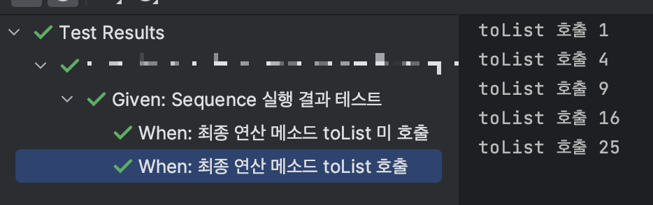시퀀스에 대한 연산은 중간 연산과 최종 연산으로 나누어 지는데, 여러개의 함수의 연산에 있어 중간에 실행되는 함수는 또다른 시퀀스를 반환하며 최종 실행되는 함수에 종료함수(toList(),Sum 등) 함수가 실행되었을 때 최종적으로 계산의 결과가 이루어 진다.