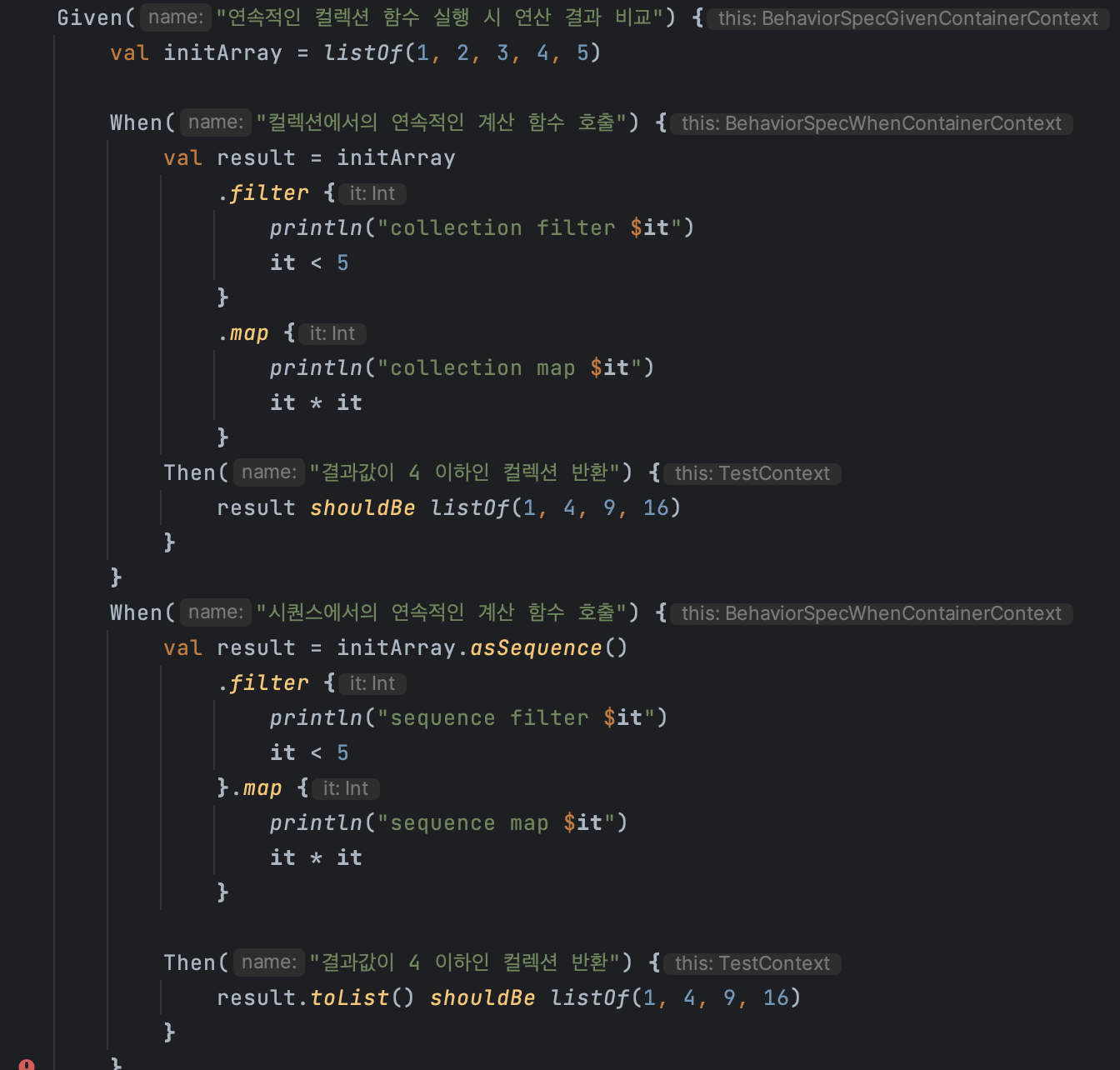 또한 Sequence 는 결과값을 반환하는 map,filter 와 같은 결과 값을 반환하는 컬렉션 함수만 있다는 점을 참고해야한다
