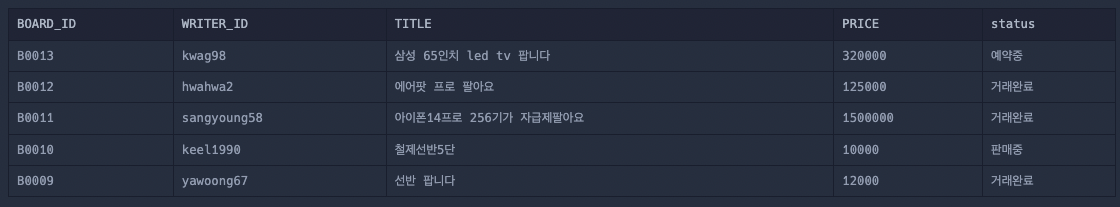 SELECT BOARD_ID,WRITER_ID,TITLE,PRICE,