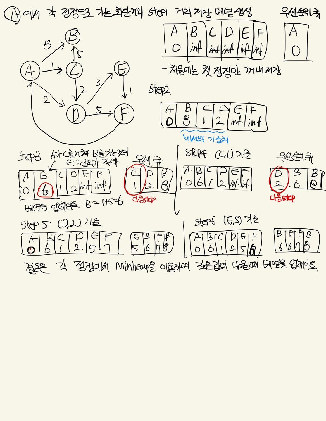 - 우선순위 큐를 사용하는 방식으로 설명, MinHeap방식을 활용해서, 현재 가장 짧은 거리를 가진 노드 정보 추출