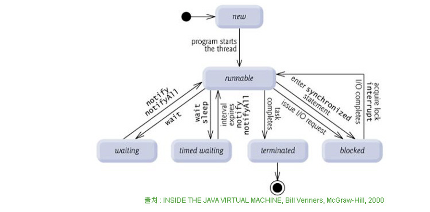 네트워킹은 스레드를 이용하여 소켓을 생성한다. -> Web Server에서 N개의 클라이언트에게 서비스를 제공해줄 때 스레드를 사용하여 서비스를 제공한다 (멀티 스레드) 스레드의 상태 6가지 (생명주기) - JVM이 TCB (Thread Controll Block ) 관리하는 곳을 통하여 Thread 정보를 관리 1. NEW - Thread를 생성 (실행할 준비는 안됨) 2. RUNNABLE - 실행 준비중 상태 혹은 실행중인 상태, JVM에서 RUNNABLE 상태인 스레드를 사용함 (start 메소드 호출) 3. WAITING - 대기 상태, wait() 메소드 호출 시 WATING 상태가 됨, notify() 메서드 호출 시 대기상태 스레드를 동기화 하여 재 시작 4. TIMED_WATING - 시간..