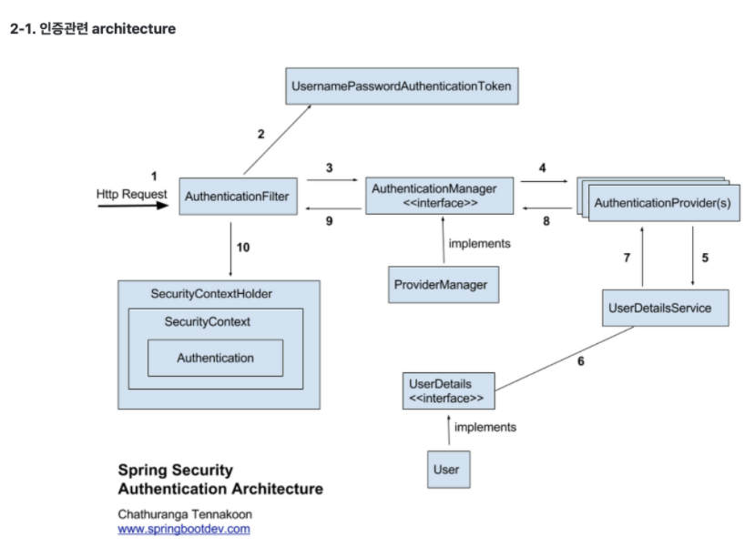 Spring Security 란? - Spring에서 제공해주는 Spring 기반 애플리케이션의 보안(인증과 권한, 인가 등)을 담당하는 스프링 하위 프레임워크 인증(Authentication) - 현재 사용자가 본인인지 확인, 로그인 시 현재 등록된 사용자 인지 여부 확인 인가(Authorization) - 인증을 통해 인증된 사용자가 요청한 자원(Resource)에 접근 가능한지 결정하는 절차 • Principal(접근 주체) : 보호받는 자원에 접근하는 대상, UserDetailsService에서 리턴한 객체 • Credential(비밀번호) : 자원에 접근하는 대상의 비밀번호 • GrantAuthority(권한) : 인증 이후, 인가 및 권한을 확인할 떄 이 정보를 참조한다. - Spring Se..